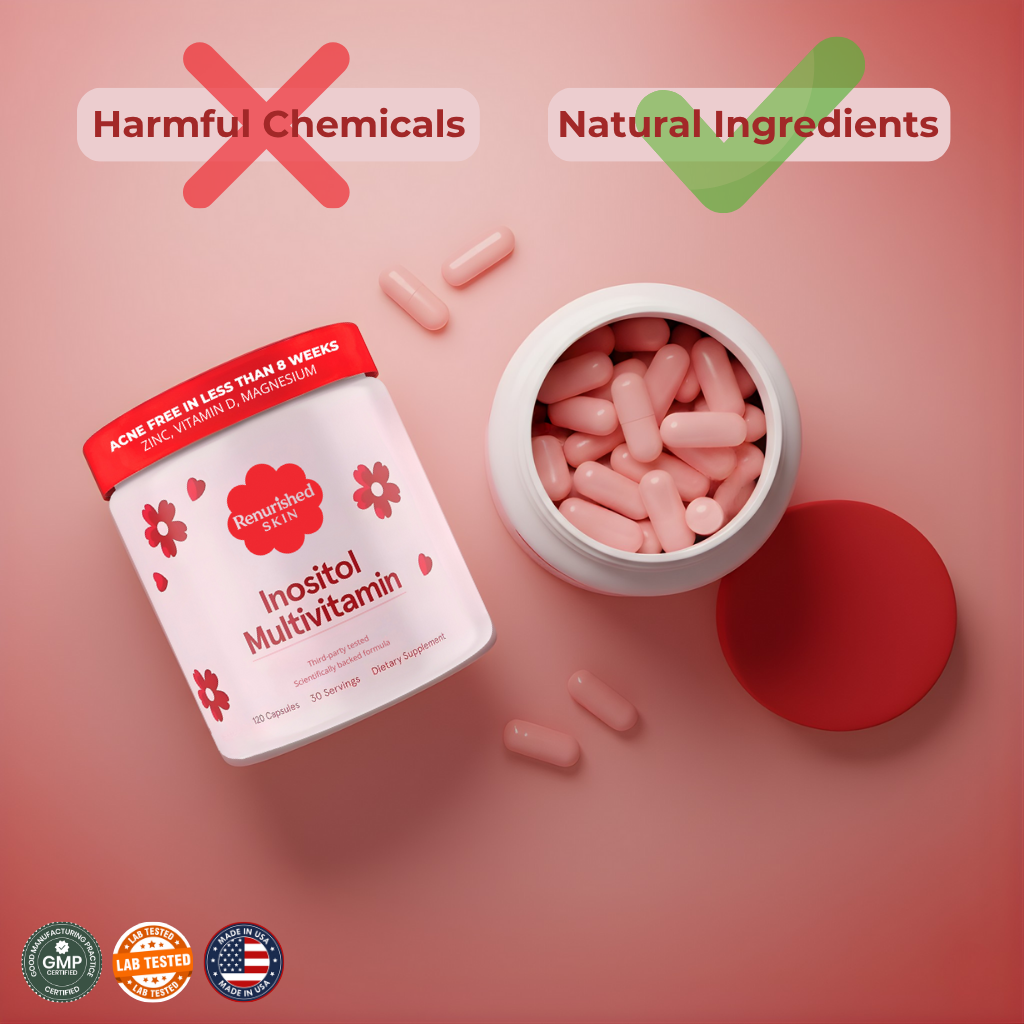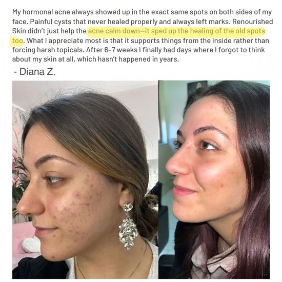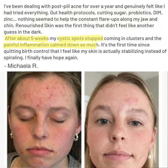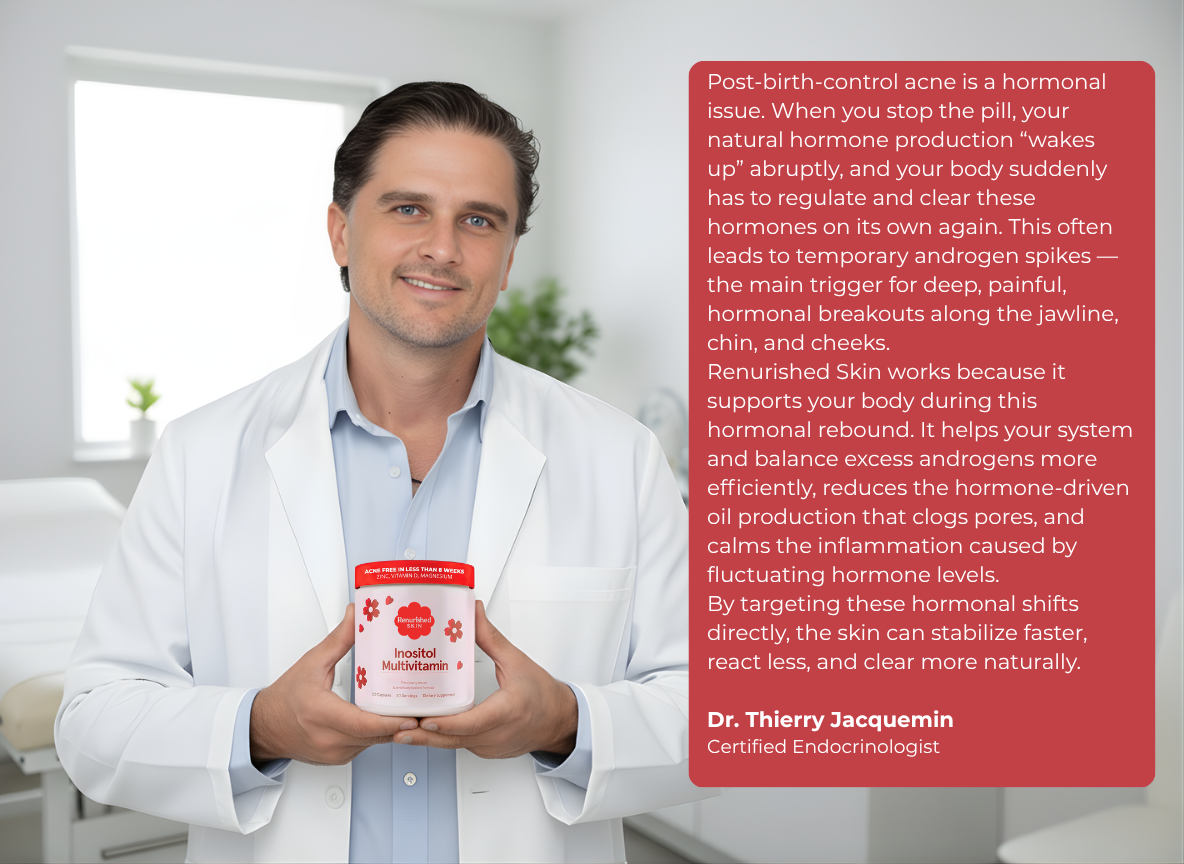 No. Renourished Skin does not add hormones or manipulate your endocrine system. Instead, it supports your body’s natural ability to rebalance after discontinuing birth control. Many women experience post-pill acne because their hormones fluctuate heavily; our formula helps the body stabilize more smoothly.